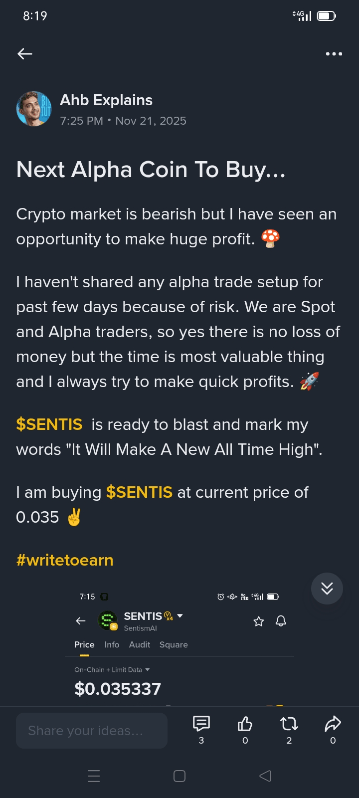 C'était le 21 novembre $SENTIS était à 0,035 et je vous ai tous dit de l'acheter. Aujourd'hui, il est monté à 0,33 🚀🚀🚀 Gros profit. 🍄