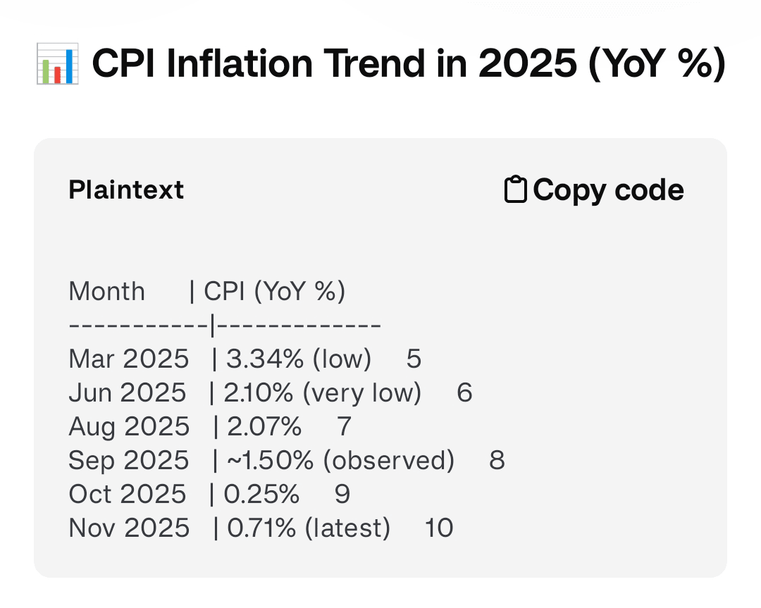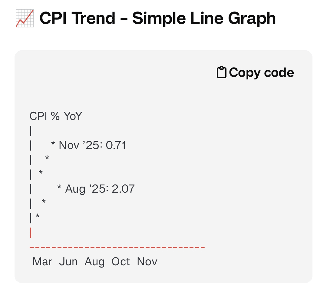 ⹠Les graphiques des tendances du CPI aident à visualiser comment l'inflation a fortement baissé par rapport aux niveaux précédents en 2025, puis a légÚrement rebondi en novembre 2025.