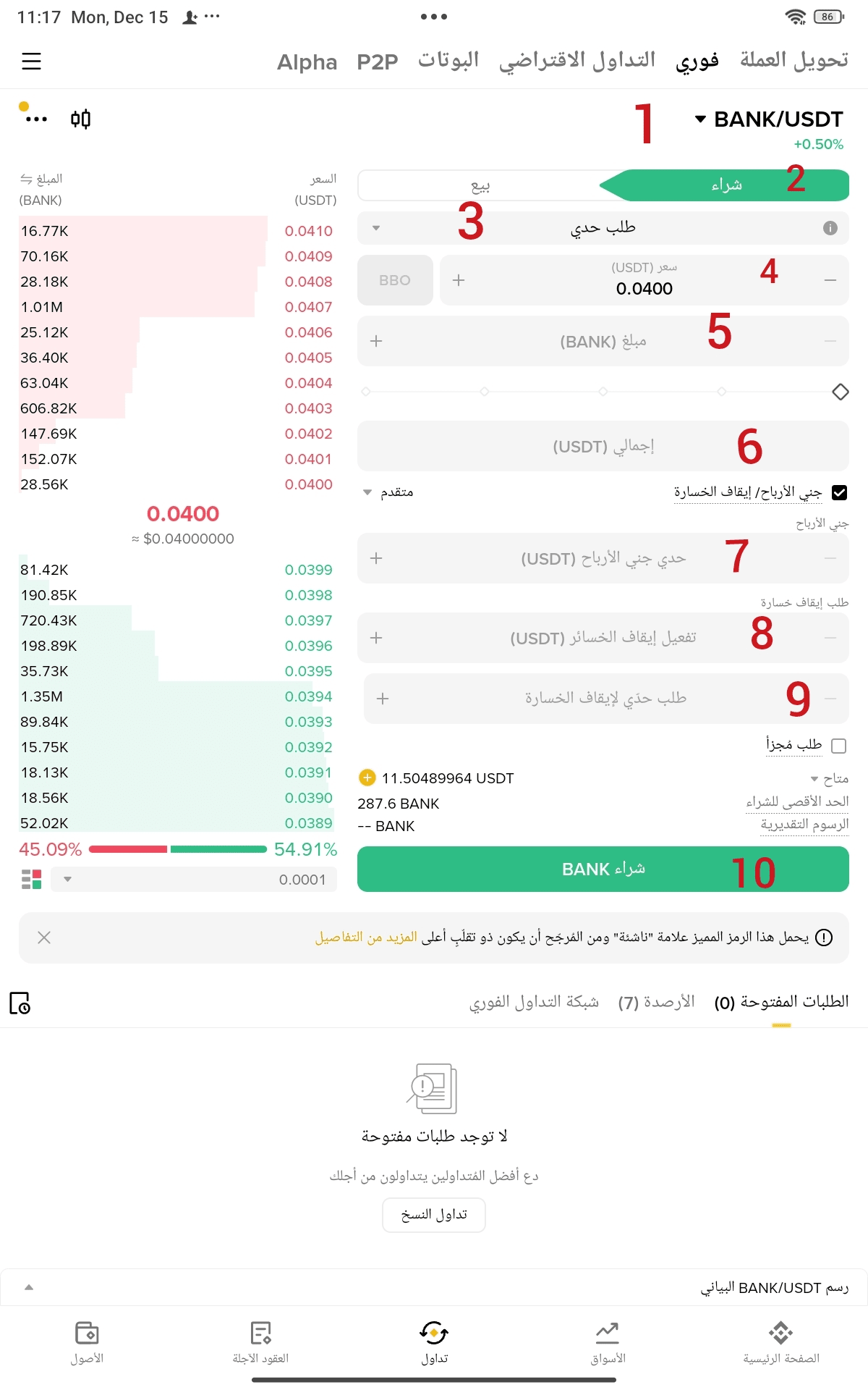 ① Paire de trading (BANK/USDT)