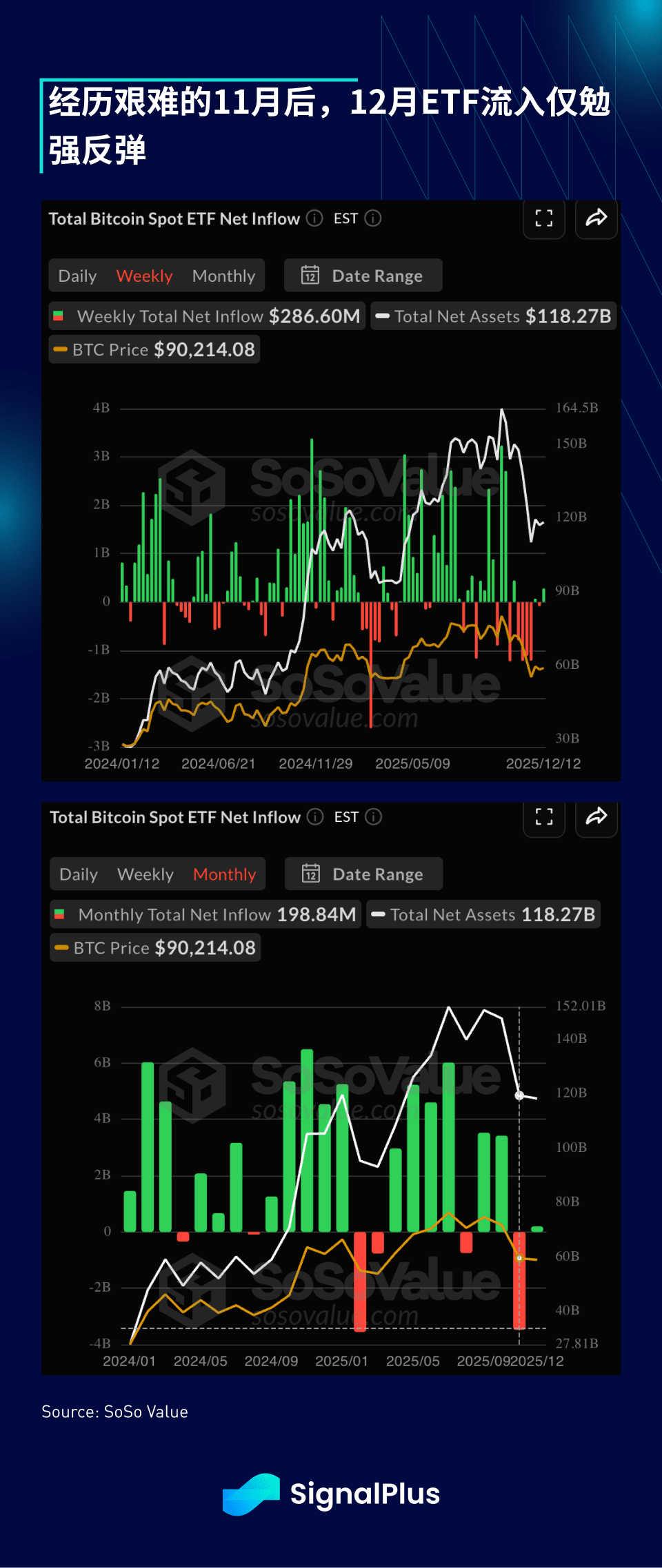 Alors que le marché mondial s'apprête à entrer en mode vacances, la caractéristique de la crypto-monnaie de négocier 24 heures sur 24, 7 jours sur 7, pourrait devenir un inconvénient avant la fin de l'année, avec une volatilité des prix qui pourrait s'aggraver, en particulier dans le cadre d'une aversion au risque accrue et d'actions de désengagement. Après plusieurs semaines de sorties de fonds, les entrées d'ETF ont légèrement rebondi la semaine dernière, avec des entrées de +0.2B depuis décembre, contre -3.5B le mois dernier.