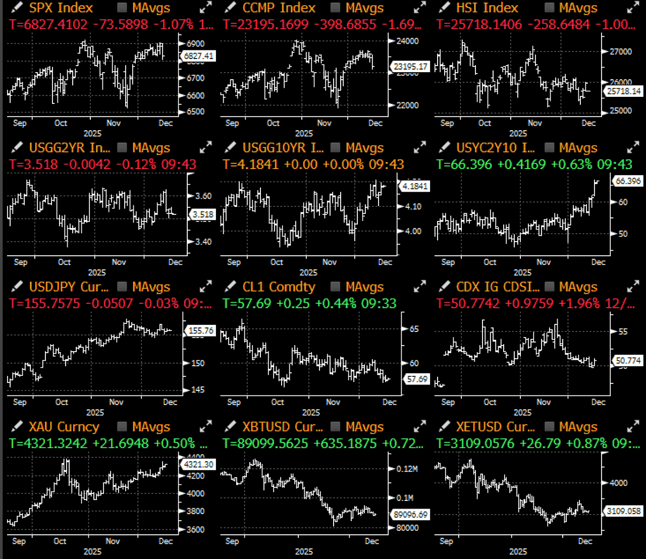 Vendredi dernier, le sentiment de risque sur le marché a effectué un revirement à 180 degrés, avec une vente massive de tous les actifs macroéconomiques, les actions technologiques en tête de la baisse, et la courbe des rendements présentant une pente baissière. Les inquiétudes concernant les résultats d'Oracle et de Broadcom ont tiré l'ensemble des actifs à risque vers le bas, tandis que des prises de bénéfices à la fin de l'année et une rotation sectorielle ont temporairement fait chuter l'indice Nasdaq de -2 % en intraday.