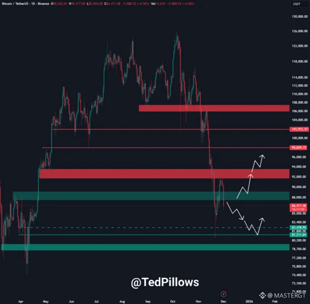 “$BTC fue rechazado desde el nivel de resistencia de $92,000-$93,000. Cayó casi 7.000 dólares y ahora se está consolidando alrededor de la zona de 86.000 dólares. Bitcoin necesita recuperar el nivel de $88,000-$89,000 aquí; de lo contrario, caerá hacia el mínimo de noviembre” resaltó el analista Ted.