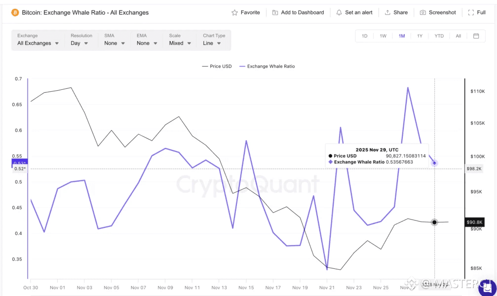 El Exchange Whale Ratio aumentó de 0.32 a 0.68 durante noviembre, y aunque retrocedió a 0.53, sigue elevado. Estos niveles reflejan que un porcentaje significativo de las entradas a exchanges provienen de grandes monederos, lo que históricamente se asocia con fases de venta, no de acumulación.