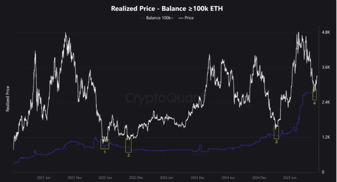 « Seulement à quatre reprises au cours des cinq dernières années, ETH a été négocié très près du prix réalisé par les baleines qui détiennent au moins 100.000 ETH », a déclaré l'analyste de CryptoQuant Onchain dans sa dernière analyse Quicktake, ajoutant :
