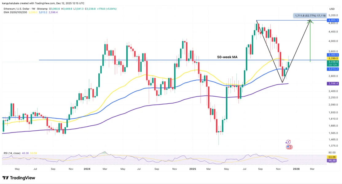 ETH teste à nouveau la moyenne mobile simple (SMA) de 50 semaines à 3.300 USD. Les haussiers doivent pousser le prix au-dessus de ce niveau pour augmenter les chances que le prix monte jusqu'à la ligne de cou à 4.955 USD et complète le motif en forme de V.