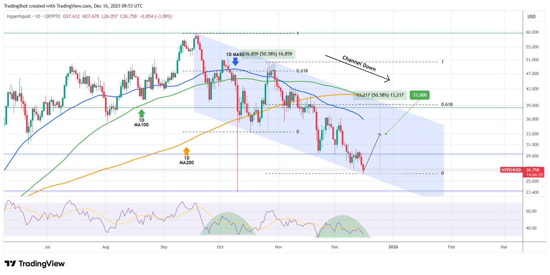 Il y a un mois (13 novembre, voir le graphique ci-dessous), nous avons donné un fort signal de vente sur Hyperliquid (HYPEUSD) après que le modèle Tête et Épaules (H&S) se soit transformé en un évident canal descendant, qui a facilement atteint notre objectif de 30,00 $ :
