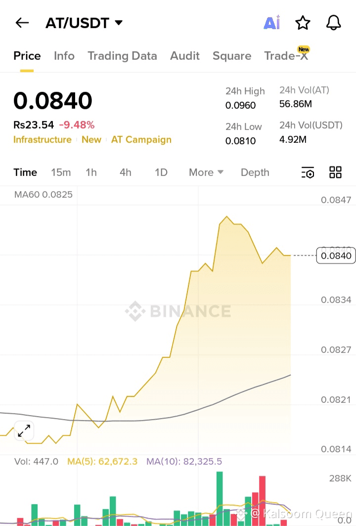 AT/USDT is currently trading around 0.0840, showing a short-term corrective move after a strong intraday rally toward the 0.0960 high. Price action remains above the MA60 (~0.0825), which indicates that the broader short-term trend is still constructive despite the recent -9.48% pullback. This retracement appears healthy, suggesting profit-taking rather than trend exhaustion. The structure reflects a classic higher-low formation, keeping bullish momentum technically intact as long as price holds above the 0.0810–0.0820 support zone.