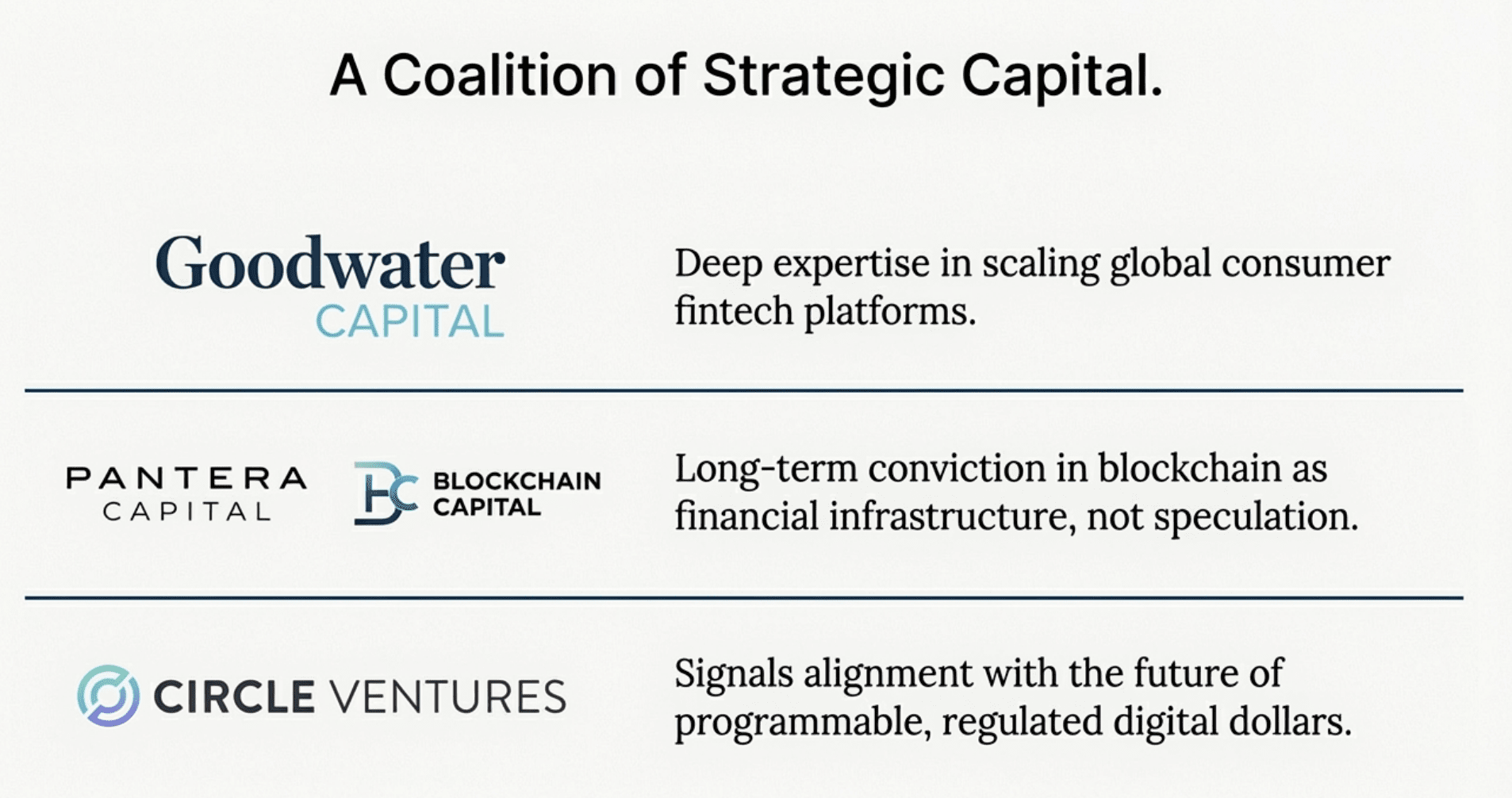 Goodwater Capital apporte une expertise approfondie dans la mise à l'échelle des plateformes fintech pour les consommateurs à l'échelle mondiale. Pantera Capital et Blockchain Capital représentent une conviction à long terme dans la blockchain en tant qu'infrastructure financière, pas en tant que spéculation. La participation de Circle Ventures signale un alignement avec l'avenir des dollars numériques programmables et réglementés.
