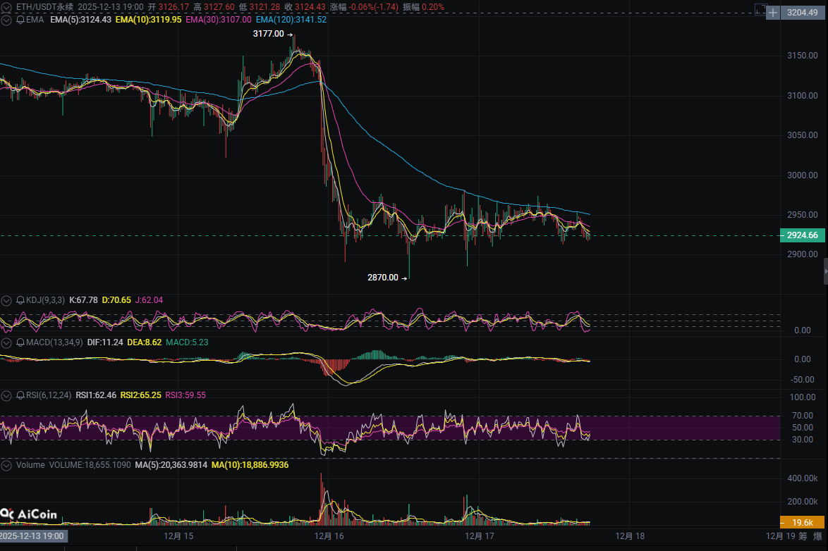D'après le graphique principal, après la chute brutale d'ETH du 16 décembre, passant de 3177 à 2870, le prix est actuellement en phase de consolidation latérale basse. Le rebond reste faible et n'a pas formé de retournement en 'V', ce qui indique généralement que la pression baissière domine encore le marché.