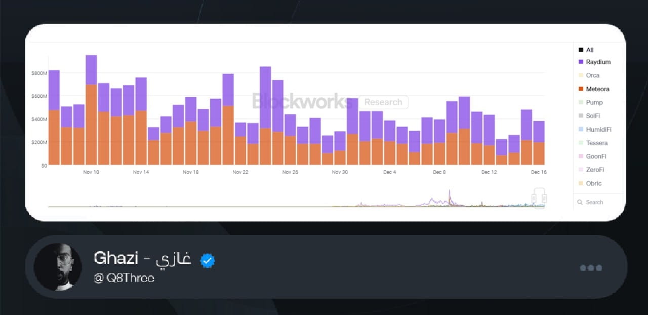Par conséquent, la part de marché de Raydium a clairement diminué, au profit de PumpFun et de Meteora.