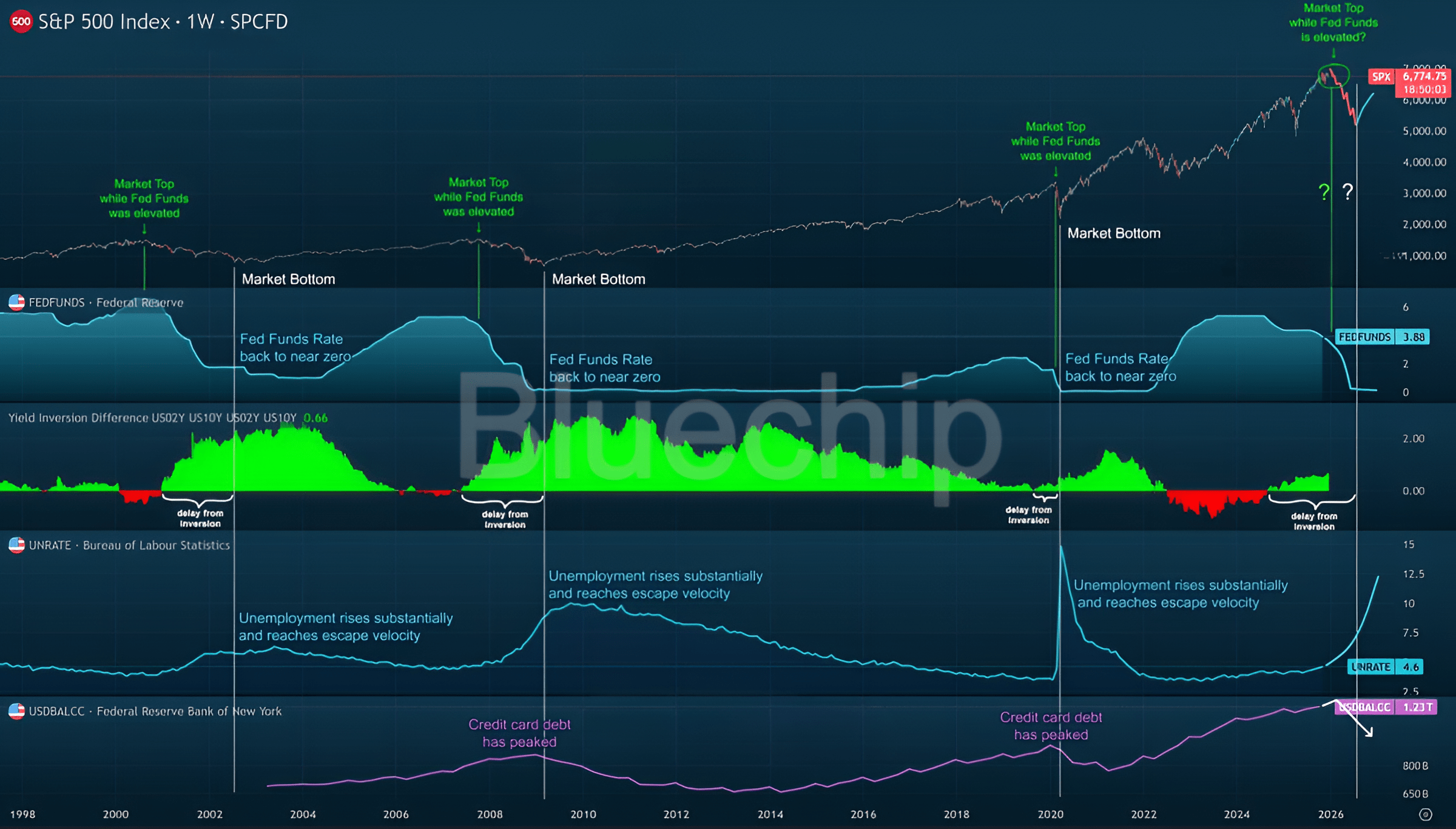 3. La Fed finit par baisser les taux. À ce moment-là, nous voyons le sommet du marché boursier. La dette des cartes de crédit atteint également son pic.