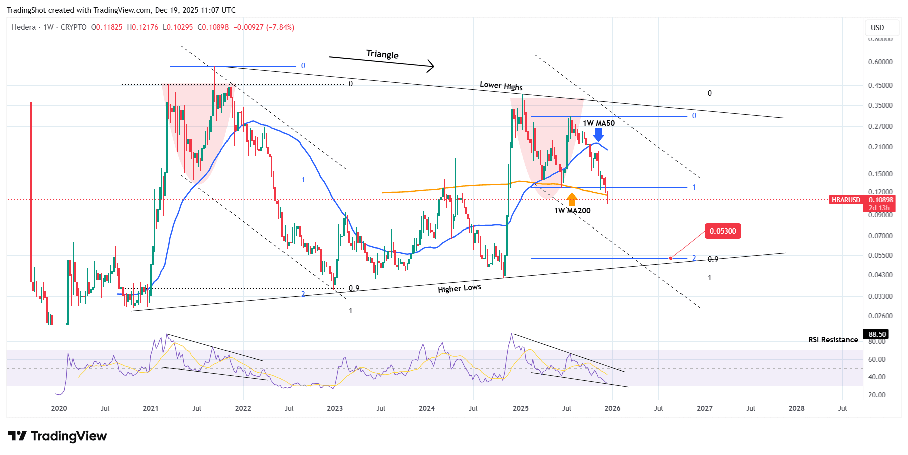 Hedera (HBARUSD) est sur le point de fermer sa bougie 1W en dessous de la MA200 1W (ligne de tendance orange) pour la première fois depuis le 11 novembre 2024. C'est un énorme développement car cela a été son Support à long terme, qui même s'il a été rompu à 3 reprises en 2025, n'a jamais fermé une semaine en dessous et s'est toujours rétabli avec un fort rallye.