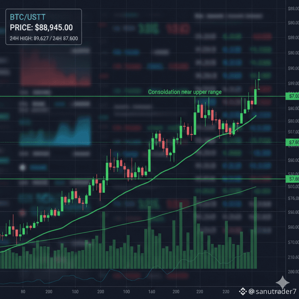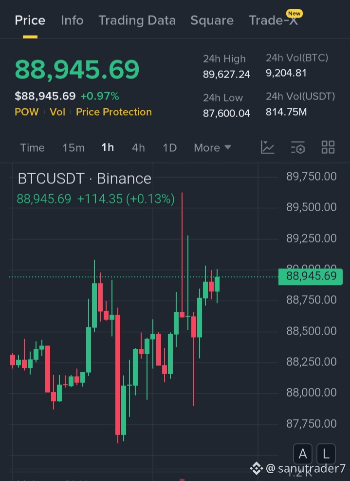 Bitcoin (BTC/USDT) is trading around $88,945, showing steady strength on the 1-hour chart. After moving between the $87,600 low and $89,627 high in the last 24 hours, price is now consolidating near the upper range. This shows that buyers are still active and defending key levels.