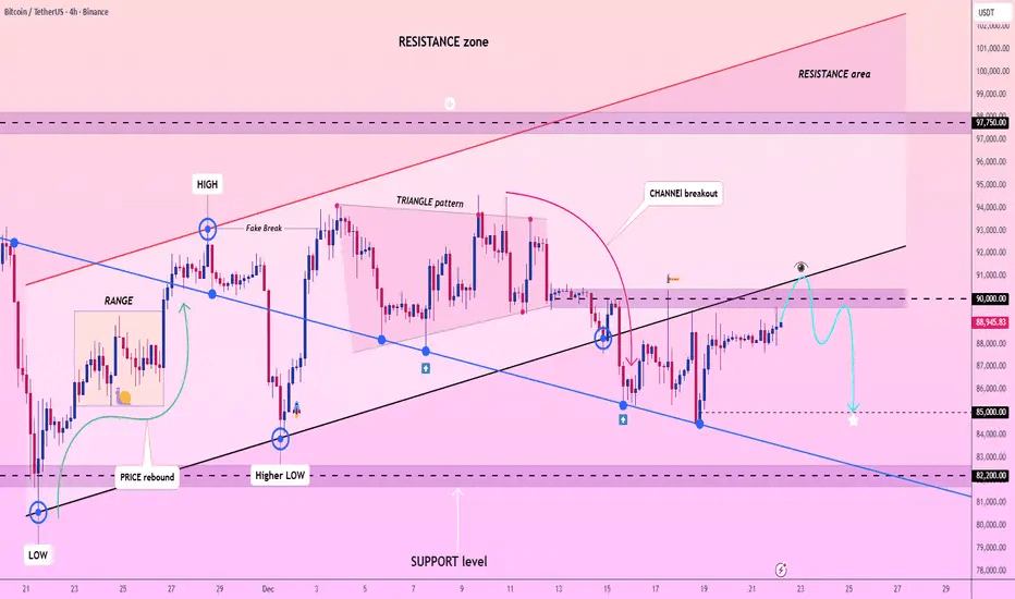 Scénario principal : rejet en dessous de 90 000 → continuation vers 85 000.