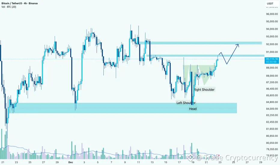 Price is now approaching the neckline area near 90,000–90,500, which aligns with a short-term supply zone. Acceptance above this level would confirm the pattern and open the path toward the upper resistance zone around 92,000.