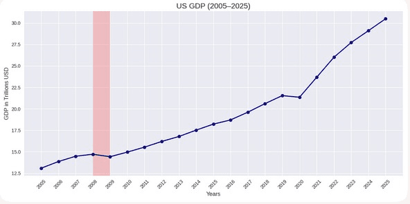Les exceptions : deux périodes marquantes de récession (2008–2009 et 2020).