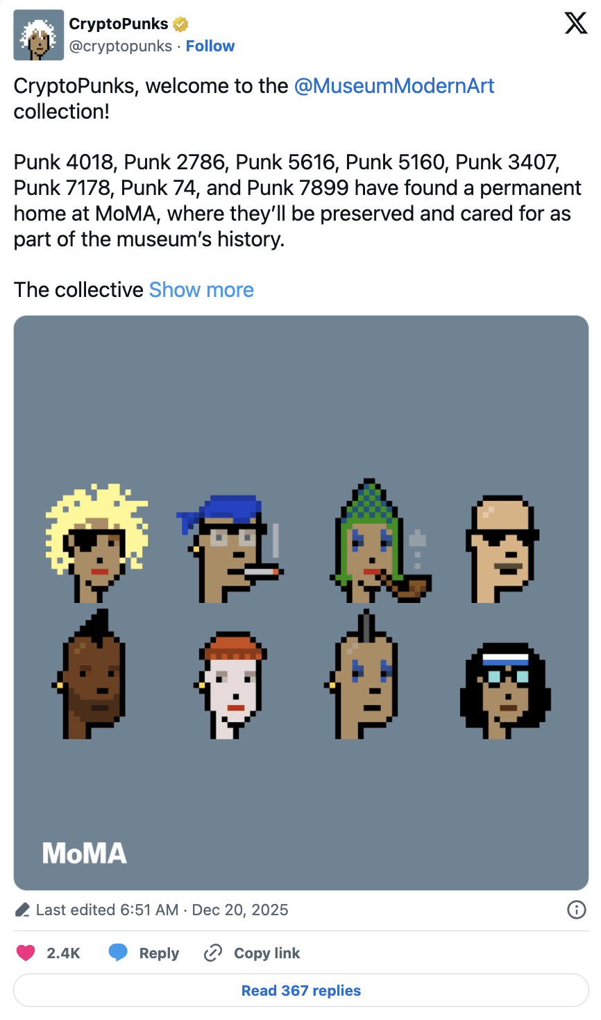 L'art numérique sur la chaîne connaît un moment historique : le Museum of Modern Art (MoMA) de New York a officiellement ajouté huit œuvres de CryptoPunks et huit œuvres de Chromie Squiggles à sa collection permanente, marquant une reconnaissance institutionnelle importante pour l'art natif de la blockchain.