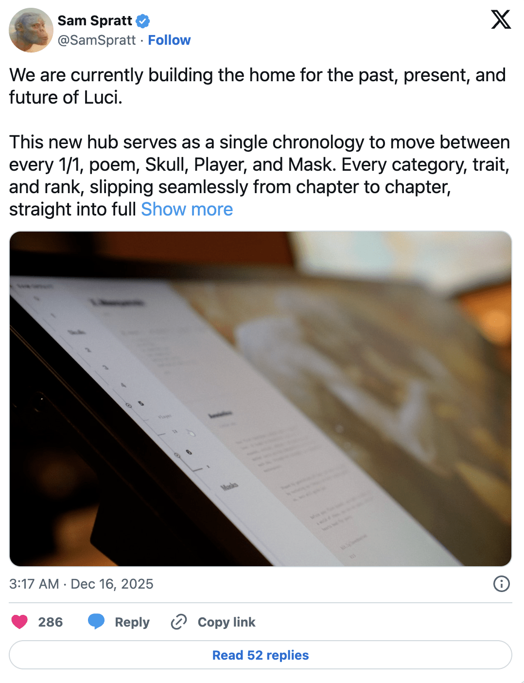 Selon un article publié le 15 décembre sur le site X, l'artiste numérique new-yorkais Sam Spratt a déclaré qu'il était en train de construire un nouveau centre en ligne pour héberger l'ensemble du passé, présent et futur de son projet Luci.