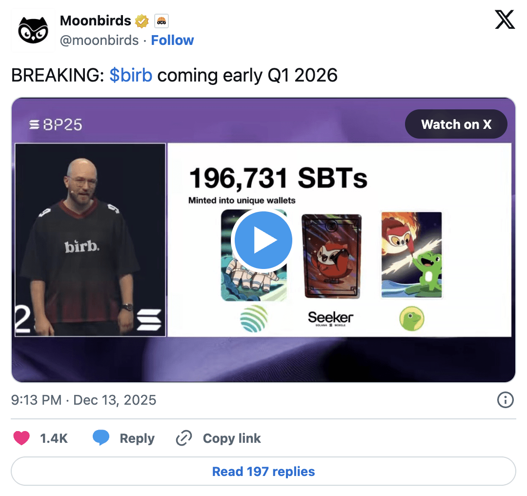 Moonbirds a annoncé son intention de lancer le token birb début 2026