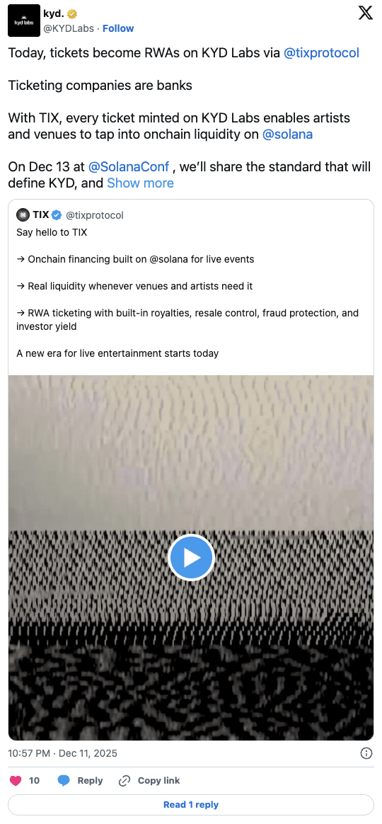 KYD Labs a déclaré dans un post X annonçant le lancement du système TIX : "Les sociétés de billetterie sont comme des banques", notant que les plateformes de billetterie d'aujourd'hui contrôlent trop de flux de trésorerie et de délais de paiement.