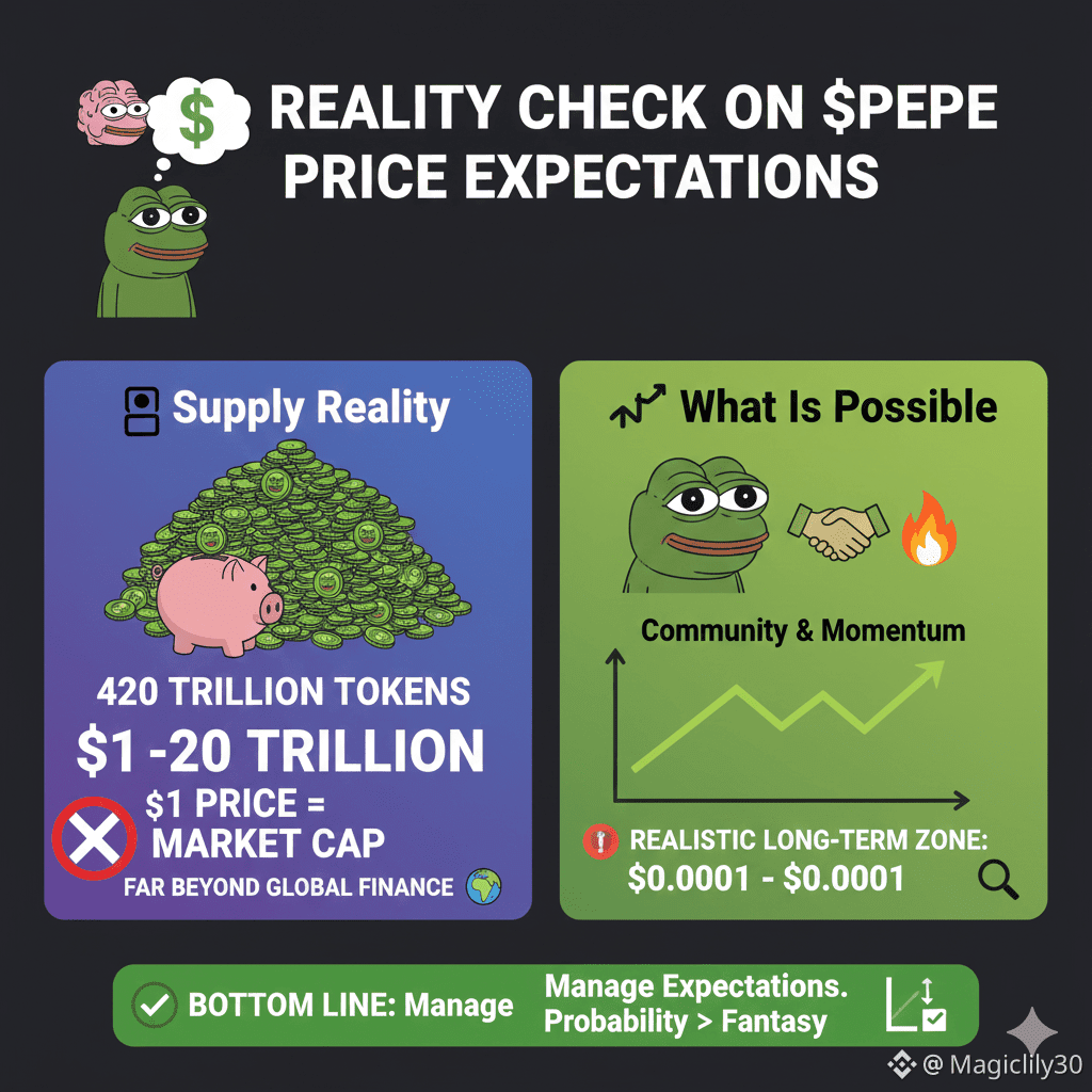 $PEPE has an extremely large circulating supply â around 420 trillion tokens. At a $1 price, that would require a market capitalization of $420 trillion, which is far beyond the size of the global financial system đ.