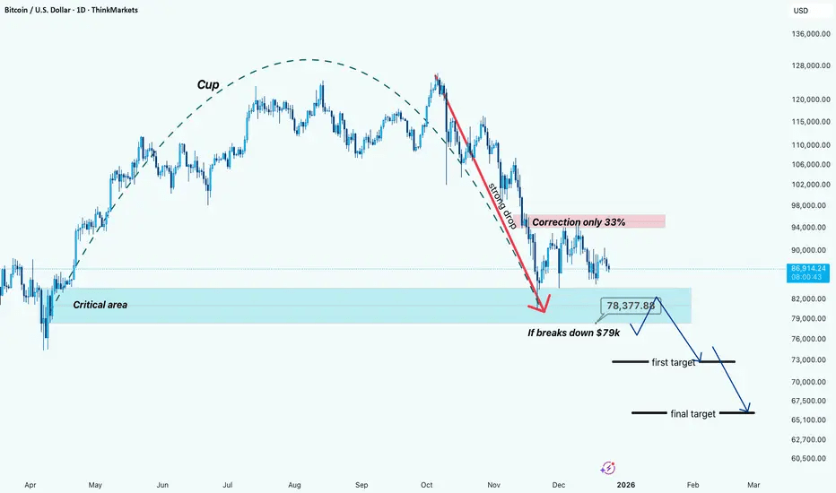 Zone de soutien critique : La zone bleue sur le graphique (~78k$–79k$) représente un niveau de soutien majeur. Une rupture en dessous de cette zone pourrait déclencher une nouvelle baisse, avec le premier objectif autour de 72k$ et un objectif final près de 66k$. Tant que ce soutien n'est pas définitivement rompu, le scénario baissier reste non confirmé.
