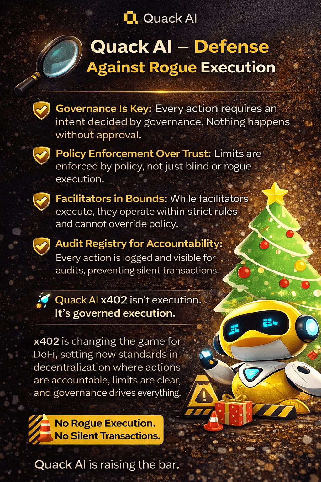 La plupart des systèmes s'appuient sur des signataires et la confiance. Quack AI remplace cela par une exécution guidée par la politique, des décisions contrôlées par la gouvernance et une pleine responsabilité.