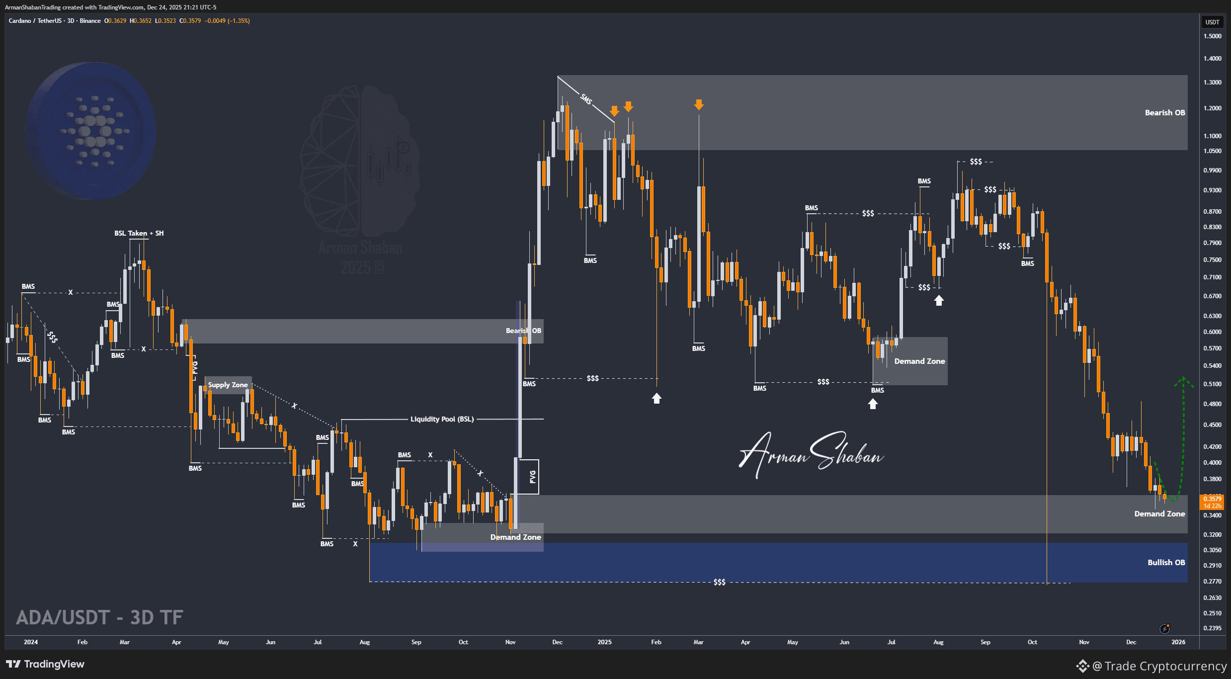 ADAUSDT entered the $0.32–$0.36 demand zone exactly as expected. We saw an initial bullish reaction that pushed the price up to $0.38, but it has now pulled back to around $0.357.