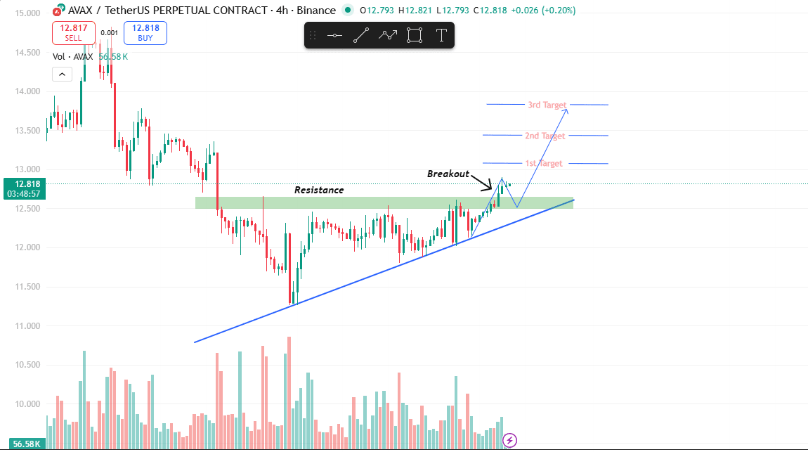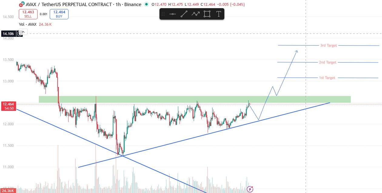 AVAX forme un triangle ascendant après une forte vente, montrant des creux plus hauts (structure haussière). Le prix a cassé la résistance et essaie de prendre un bon élan. Mais nous attendons un retest sain pour un meilleur rebond.