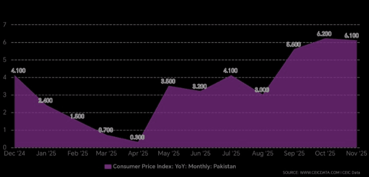 L'indice des prix à la consommation (IPC) du Pakistan a enregistré 281,78 points d'indice en novembre 2025, montrant un taux d'inflation d'environ 6,1 % par rapport à l'année précédente — légèrement en baisse par rapport aux 6,2 % d'octobre, indiquant une pression sur les prix, bien qu'elle soit persistante, au niveau local.