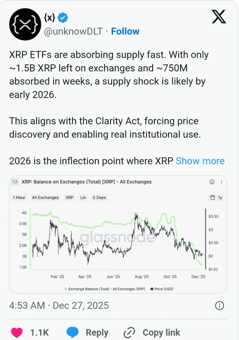 La proposition $XRP sur les bourses s'épuisent rapidement... et le marché commence à le remarquer. Les données récentes sur la chaîne montrent qu'il ne reste plus que ~1,5 milliard XRP sur les bourses - un minimum historique. Ce n'est pas un comportement de vente aléatoire... c'est un changement clair vers la détention à long terme 🏦💼🔥 Que se passe-t-il réellement ?🏦 Les institutions accumulent silencieusement. Les gros acteurs ne négocient pas XRP - ils le retirent des bourses pour le stockage. Historiquement, ce comportement a précédé d'importantes compressions d'offre.📊 Les ETF XRP au comptant absorbent rapidement l'offre. Selon les données sur les flux d'ETF : ✅ 5 ETF XRP au comptant lancés 💰 $1.14B+ de flux nets 📦 $1.40B+ AUM en seulement quelques semaines 👉 Les ETF ne retournent pas les tokens - ils les bloquent. Chaque influx = moins de XRP disponible à la négociation. ⚠️ Les analystes avertissent : choc de l'offre d'ici 2026 ? Les analystes en DLT et en structure de marché suggèrent que si : Les soldes sur les bourses continuent de baisser, les flux d'ETF se poursuivent, la demande institutionnelle s'accélère 💥 Le marché pourrait faire face à un choc de l'offre dès 2026. Lorsque la demande augmente et que l'offre liquide disparaît, le prix n'a qu'une seule direction 📈⚖️ Clarté réglementaire = feu vert pour les institutions. Des réglementations crypto plus claires signifient : réduction de l'incertitude, garantie de la bonne garde, déverrouillage du déploiement de capital à grande échelle. Pour XRP, cela pourrait signifier l'adoption au-delà de la spéculation - dans une infrastructure financière régulée 🌍🛠️ Les mises à jour du XRP Ledger ajoutent du carburant. Les mises à jour prévues de XRPL visent à améliorer : ⚡ Scalabilité 🔗 Interopérabilité 🏦 Cas d'utilisation de la liquidité institutionnelle. Les analystes estiment que cela traduit XRP d'un "actif de négociation" à un niveau de règlement mondial. 🔮 Prévisions optimistes des analystes (si les tendances se maintiennent) 📈 Les modèles institutionnels conservateurs suggèrent : $8–$15, si les flux d'ETF restent stables 📈 Prévisions agressives basées sur l'utilité : $25–$50+ dans un contexte de choc d'offre postérieur 📈 Thèse d'infrastructure à long terme : Un XRP à trois chiffres n'est pas rejeté par les macro-analytiques si l'adoption des règlements mondiaux se matérialise 🌐🧠 Dernière pensée. Cela ne ressemble pas à un cycle de hype. Cela ressemble à un changement structurel. Moins de XRP sur les bourses. Plus d'ETF bloqués. Plus d'institutions. Plus d'utilisation réelle. 💬 Question pour vous : Êtes-vous prêt avant que la foule ne réalise qu'il n'y a plus rien à acheter ? 👀💎👇 Laissez vos pensées | 👍 J'aime | 🔁 Partager | ➕ Abonnez-vous pour plus $XRP d'immersions profondes #Xrp🔥🔥 #Ripple #Binance #crypto
