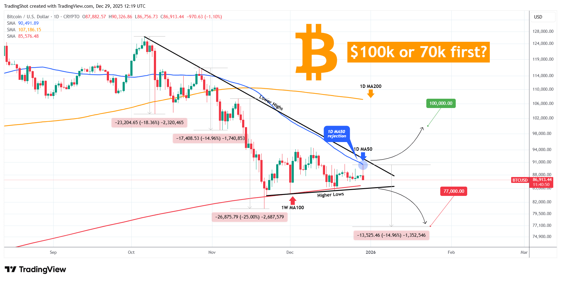 En conséquence, si le prix dépasse la ligne de tendance des bas plus bas, nous prévoyons un rallye contre-tendance au début de 2026 pour tester le MA200 sur 1D (ligne de tendance orange) et cela au moins 100000$, comme le BTC l'a fait pendant tous ses précédents cycles baissiers. Si en revanche la ligne de tendance des sommets plus élevés casse en premier, nous prévoyons une baisse minimum de -14,96 % (la plus faible séquence de chute depuis le début du cycle baissier) visant 77000$.