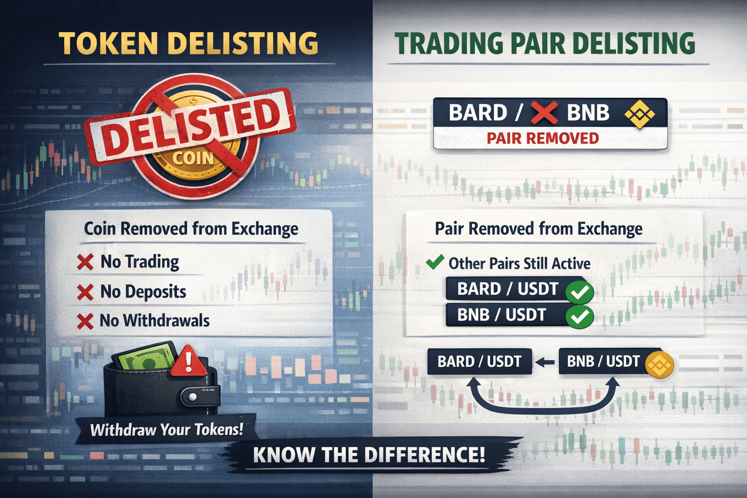 D'autre part, retirer une paire de trading—comme BARD/BNB—signifie que l'échange cesse d'autoriser les échanges entre ces deux jetons spécifiques, mais les jetons eux-mêmes restent listés sur la plateforme. Les utilisateurs peuvent toujours échanger ces jetons dans d'autres paires disponibles, telles que BARD/USDT ou BNB/USDT. Cela se produit généralement lorsqu'une paire de trading a un faible volume ou une faible liquidité, rendant inefficace pour l'échange de soutenir.