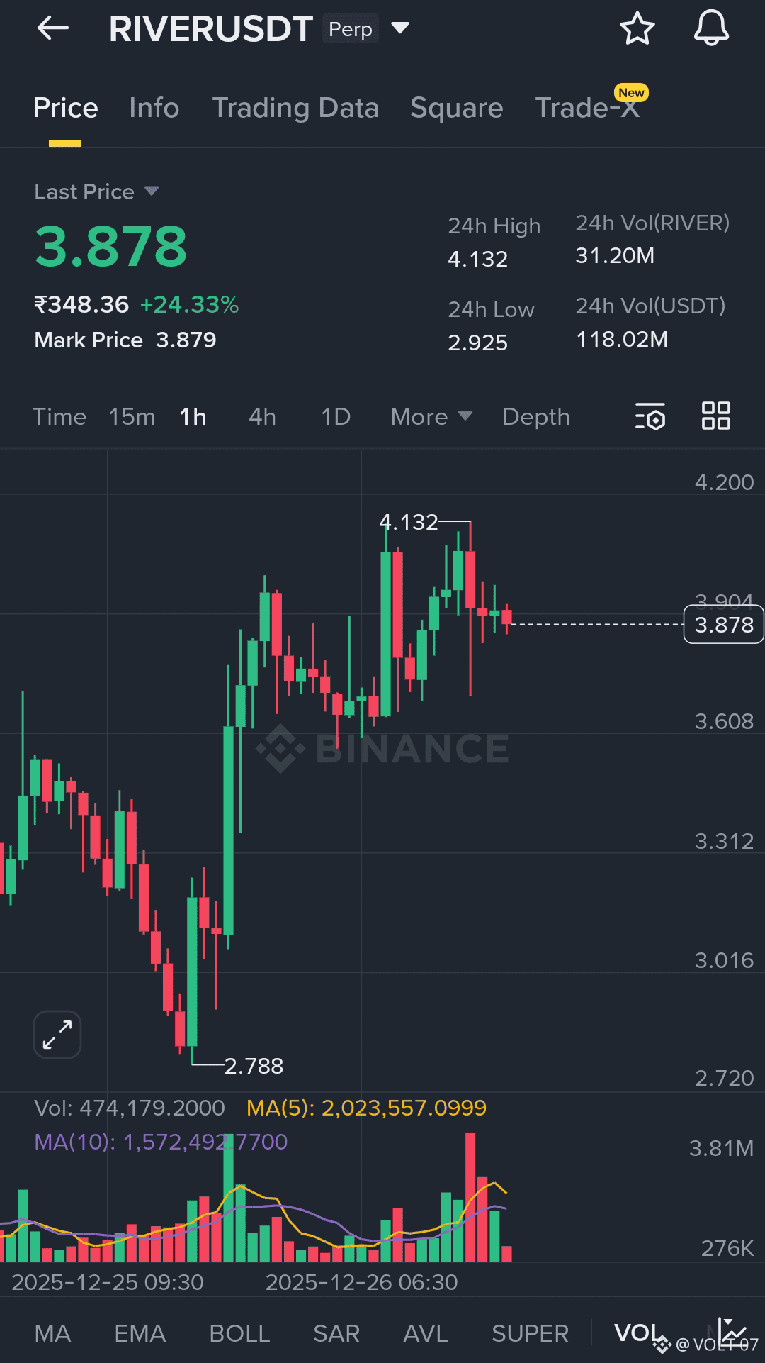 Retour en arrière et consolidation : Après avoir atteint des sommets proches de 11,5 $ – 12,9 $, RIVER a corrigé vers des niveaux moyens autour de 7 $ – 9 $+, les traders ayant partiellement pris des bénéfices.