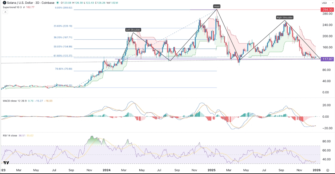 Le prix de Solana a formé un grand motif de tête et d'épaules sur le graphique de trois jours. Le prix de la pièce dépendra des entrées de l'ETF en cours $SOL . Les autres catalyseurs pour le jeton seront la mise à niveau Alpenglow et la croissance RWA.