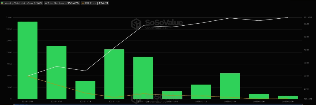 Les ETF Solana ont attiré plus de 763 millions de dollars en entrées nettes cumulées, avec leurs actifs nets s'élevant à 950 millions de dollars. Cela équivaut à 1,36 % de la capitalisation boursière.
