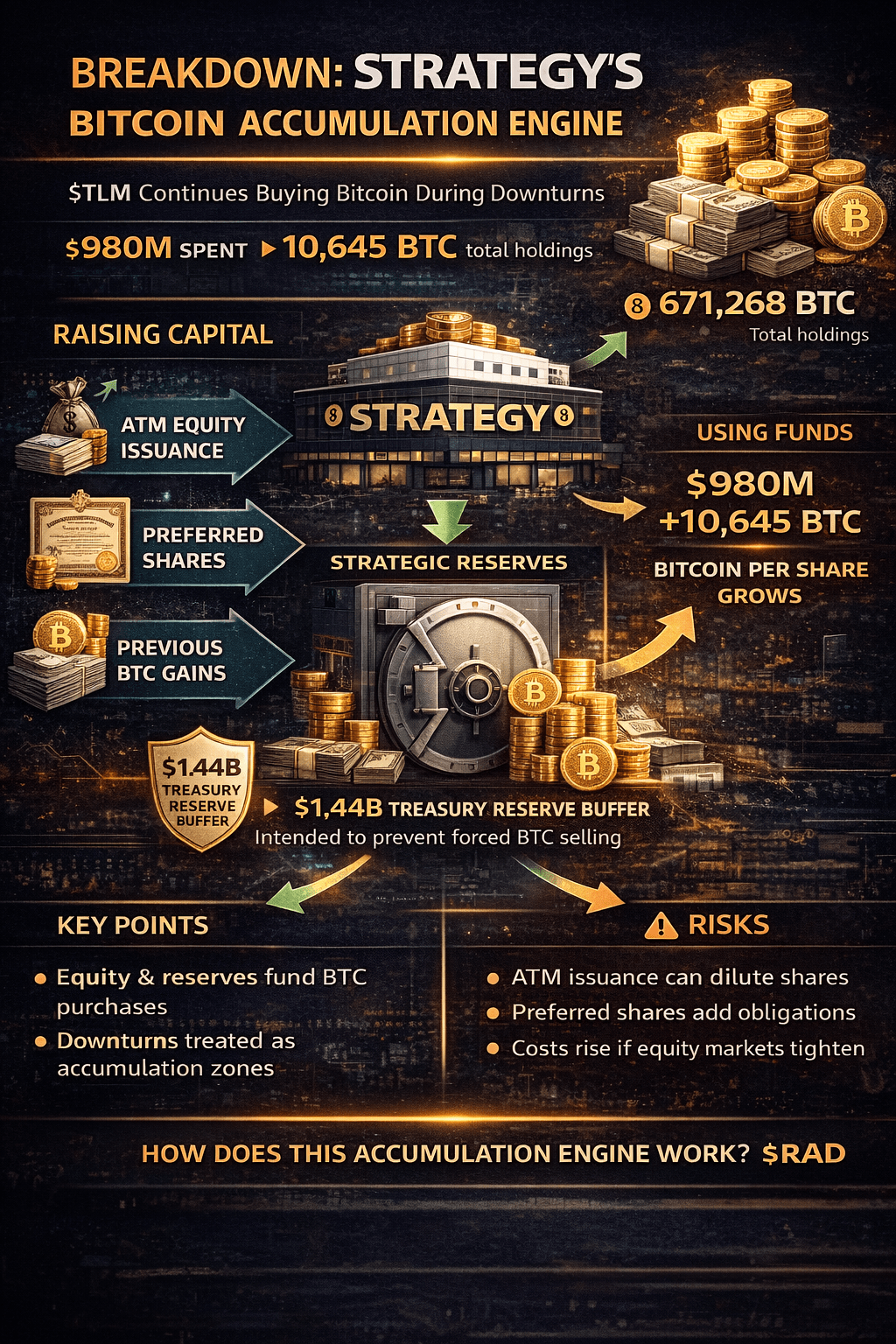 L'achat récent de Bitcoin par la stratégie pour 980 millions de dollars met en évidence un moteur d'accumulation bien conçu ancré dans le financement des marchés publics, les tampons de réserve et le timing stratégique. Ce modèle non seulement augmente ses avoirs totaux en BTC pendant les ralentissements mais positionne également l'entreprise comme un indicateur de la demande institutionnelle de Bitcoin.