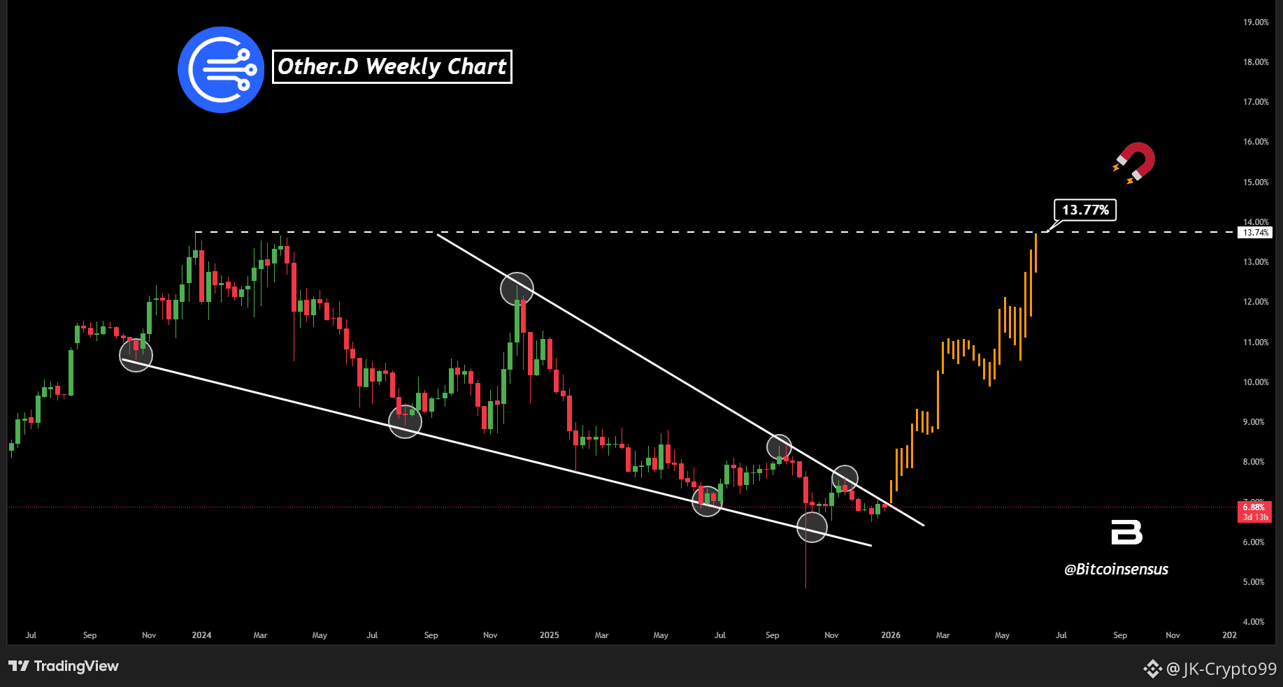 Watching the 13.77% level as key upside magnet