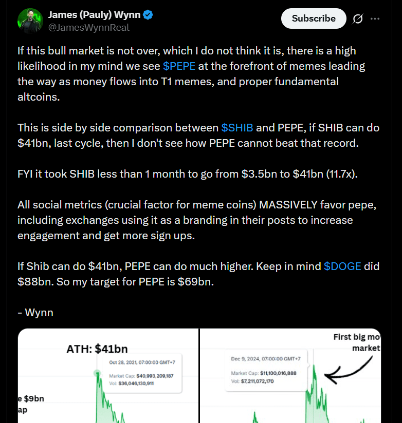 Wynn a comparé la position actuelle de PEPE à la performance de Shiba Inu lors du dernier marché haussier. Il a noté que SHIB avait atteint une capitalisation boursière de 41 milliards de dollars dans le cycle précédent et a soutenu que PEPE pourrait dépasser ce niveau.