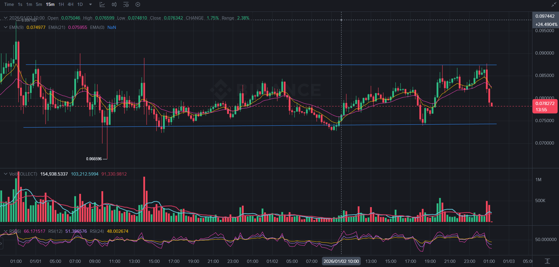 $COLLECT montre de la force sur le graphique de 15 minutes après un rebond net sur le support. Le prix se négocie maintenant au-dessus des EMA clés avec un volume en hausse et un RSI s'améliorant — signalant une dynamique haussière.