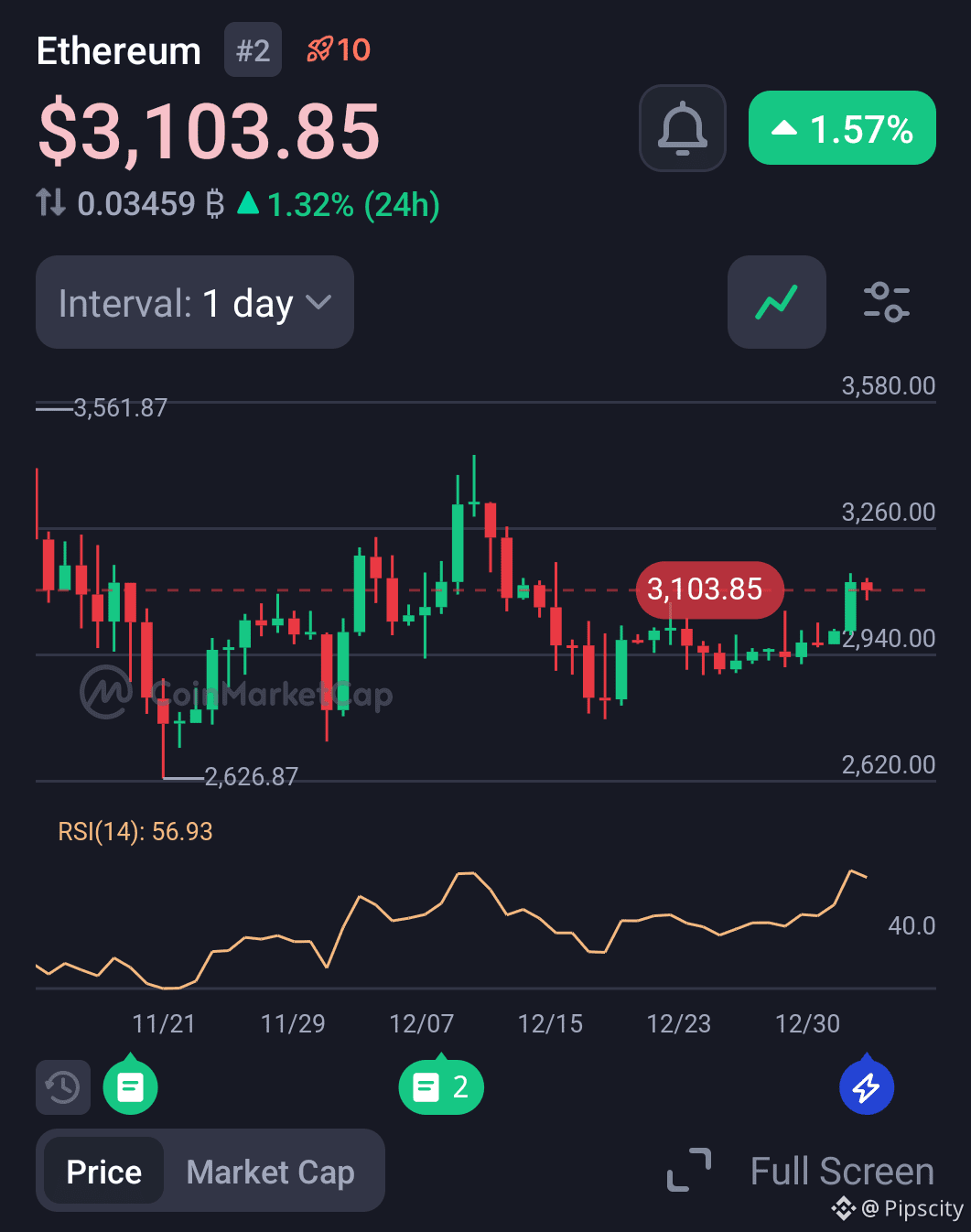 Buy‑the‑dip setup: Traders may accumulate Ethereum around 3,050–3,080 USDT and target breakout above 3,200 USDT. Potential upside extends toward 3,350 USDT if volume expands after resistance breach; stop‑loss below 2,950 USDT
