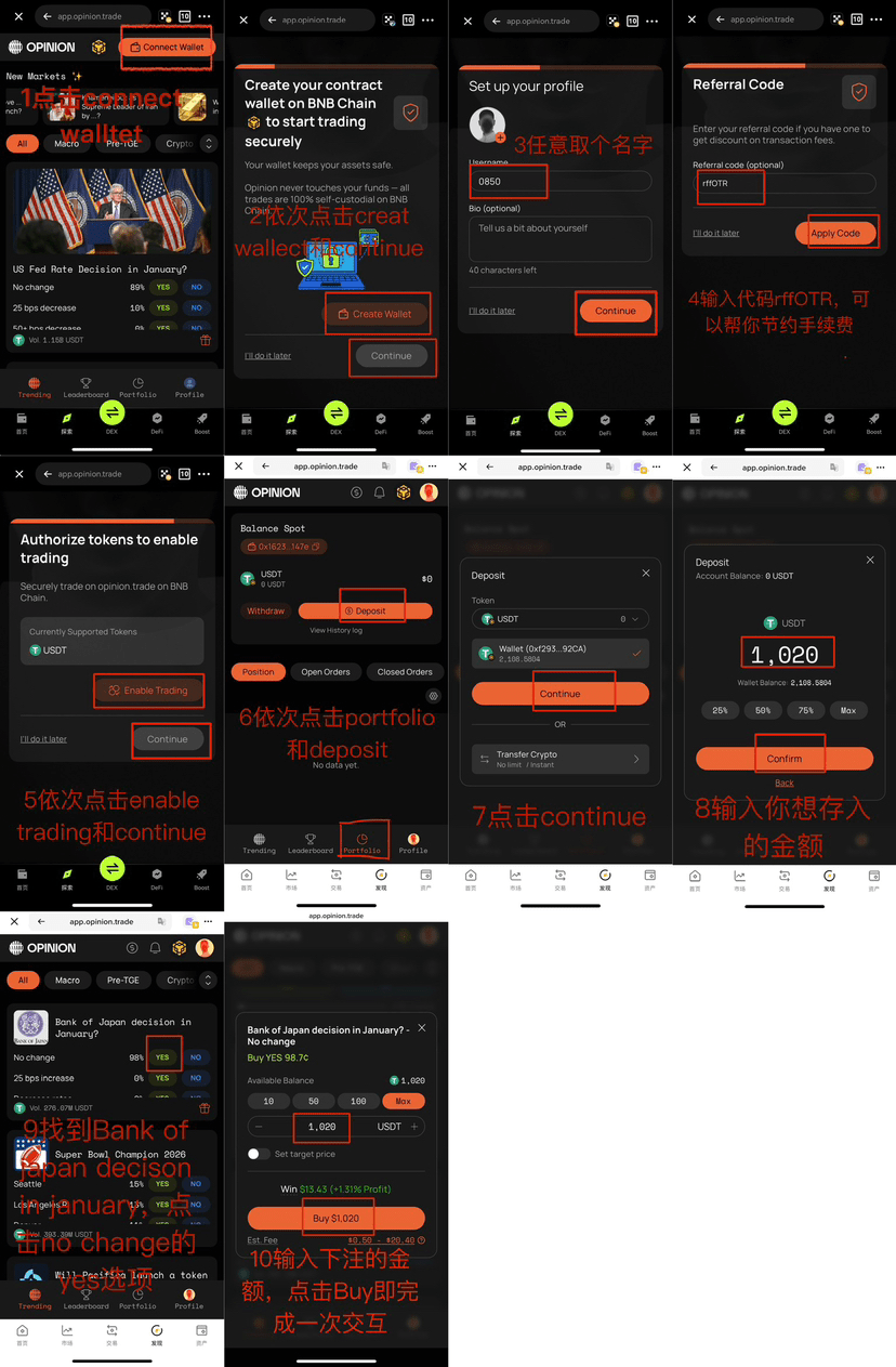 Il existe de nombreuses façons de jouer à l'Opinion, avec un minimum de seulement 10 dollars. Notre objectif est d'obtenir des points, qui seront ensuite échangés contre des airdrops. Plus le volume de transactions est élevé, plus il y a de points. Voici un tutoriel pour les débutants :