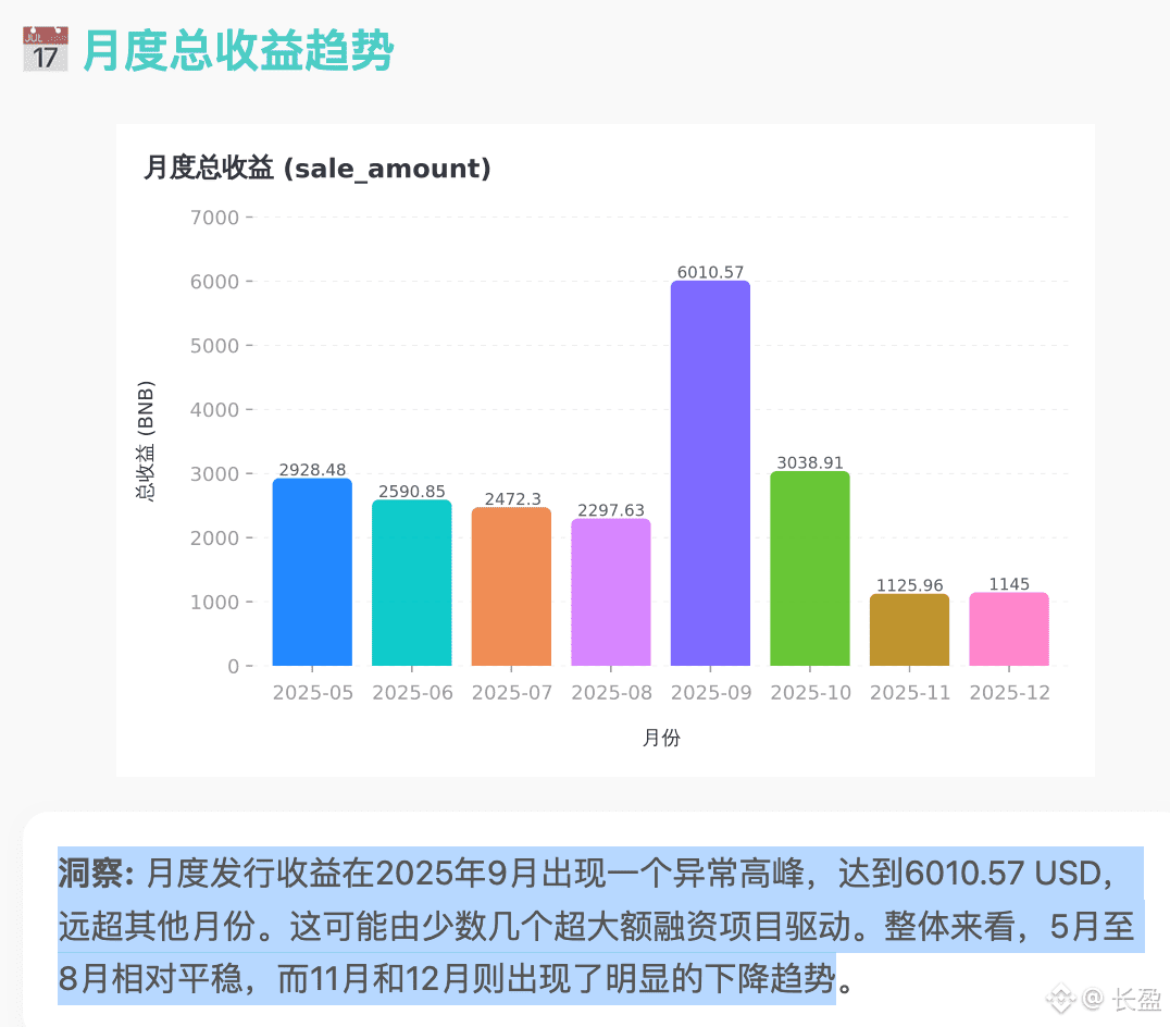 AI洞察: 月度发行收益在2025年9月出现一个异常高峰,达到6010.57 USD,远超其他月份。这可能由少数几个超大额融资项目驱动。整体来看,5月至8月相对平稳,而11月和12月则出现了明显的下降趋势。