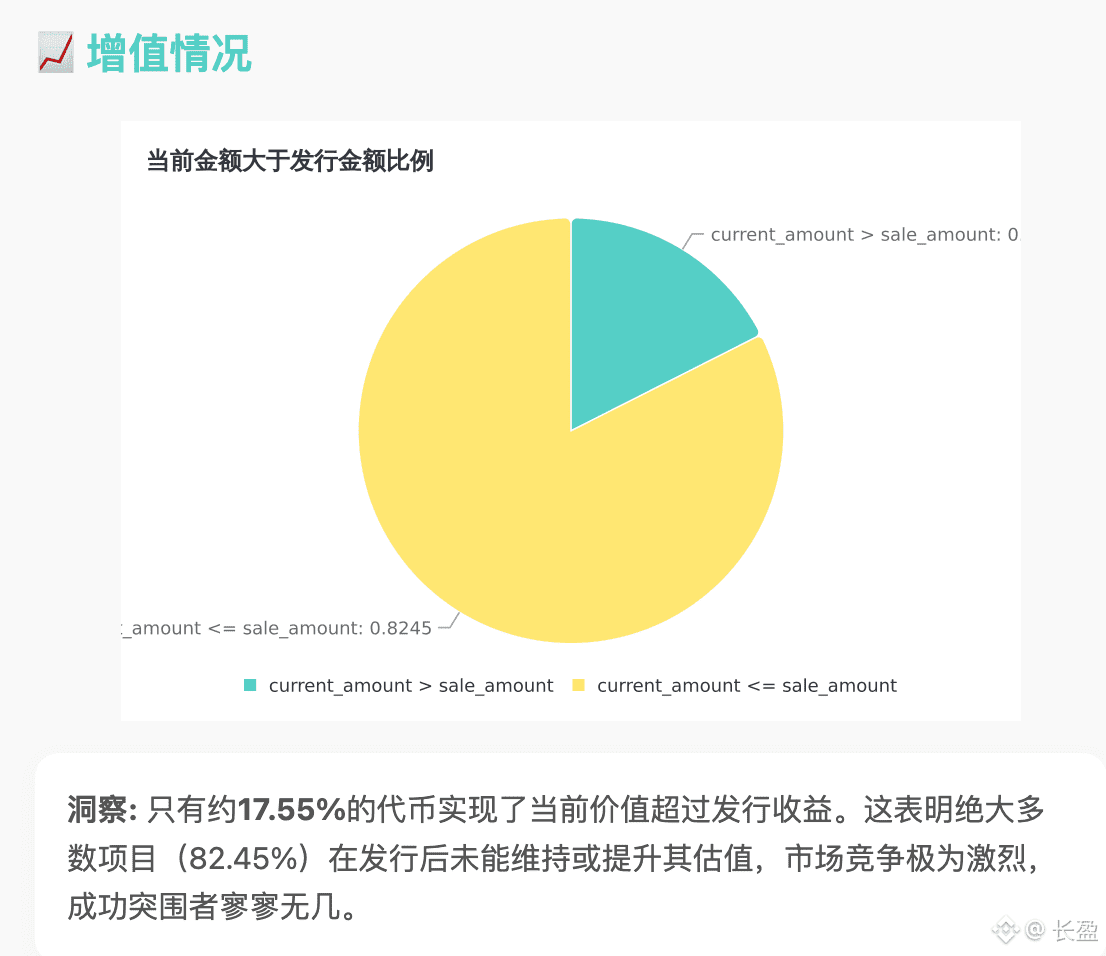 AI洞察: 约18.07%的代币已成功上线中心化交易所(CEX)。这是一个关键的里程碑,通常伴随着流动性的大幅提升和价格发现机制的完善。与增值比例接近,说明上所是项目取得初步成功的标志之一。