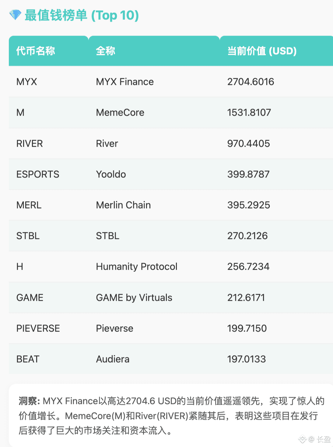 AI洞察:MYX Finance以高达2704.6 USD的当前价值遥遥领先,实现了惊人的价值增长。MemeCore(M)和River(RIVER)紧随其后,表明这些项目在发行后获得了巨大的市场关注和资本流入。
