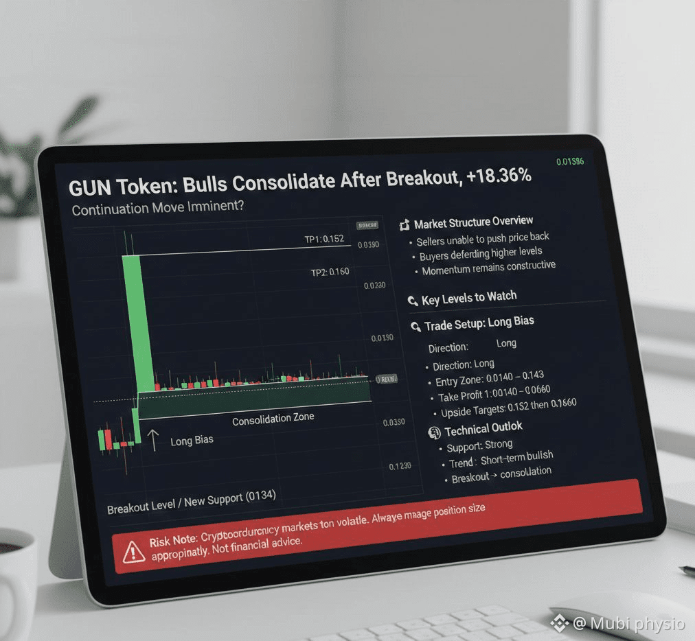 The $GUN GUN token is showing impressive strength after a decisive breakout, gaining +18.36% to trade around 0.01386. Rather than giving back gains, price action has shifted into a tight consolidation, a classic sign that bulls remain in control.