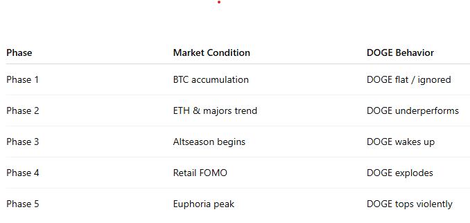4️⃣ Chronologie du cycle de liquidité — Comment DOGE évolue généralement
