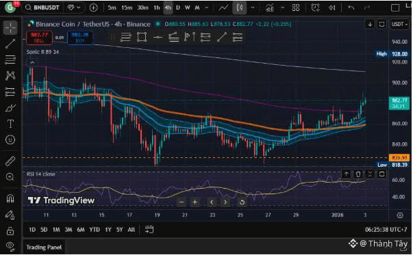 Tại thời điểm viết bài, BNB giao dịch quanh mức ~884 USD, giá có điều chỉnh nhẹ nhưng hoàn toàn không yếu — đặc biệt khi đặt trong bối cảnh hoạt động mạng lưới và xu hướng vĩ mô.