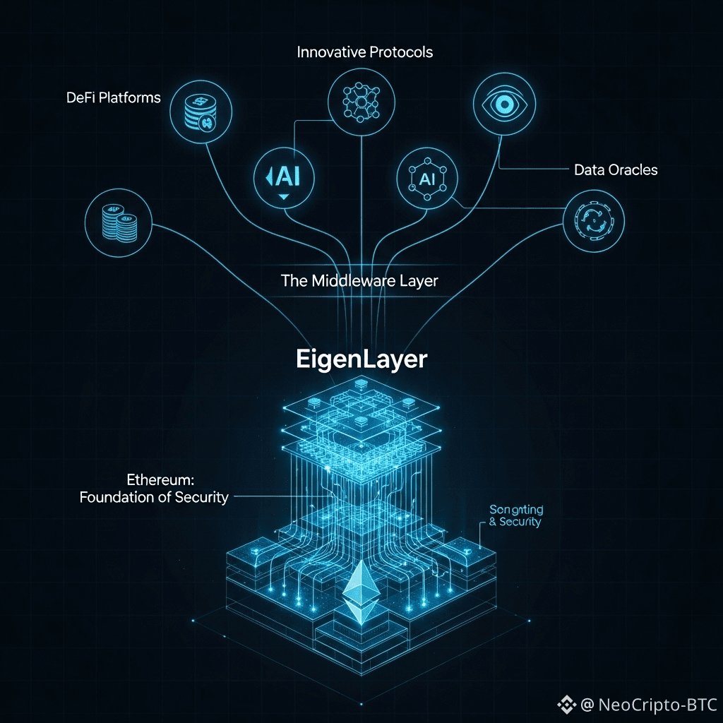 EigenLayer no es solo otro protocolo DeFi; es una capa intermedia que actúa como mercado de seguridad. Conecta a los stakers de ETH (oferta de seguridad) con protocolos que necesitan seguridad (demanda).