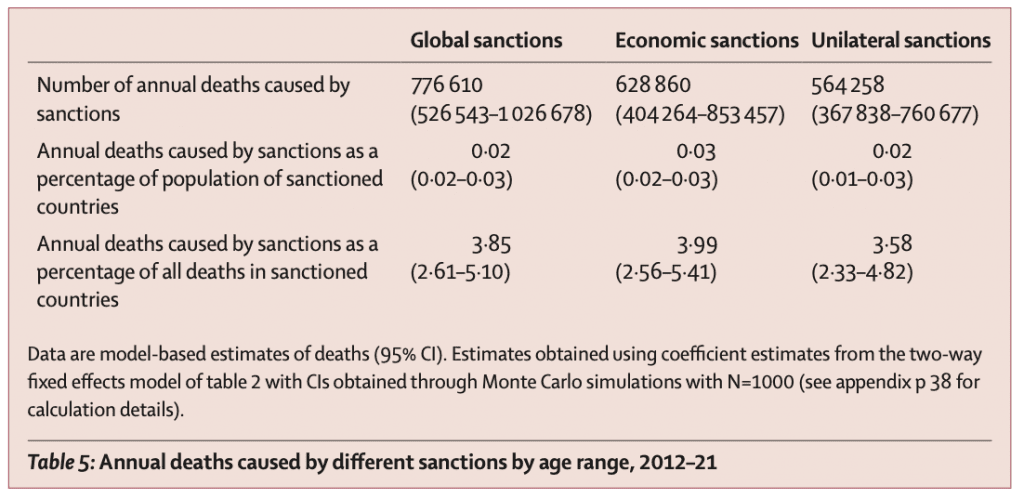 Les auteurs ont estimé que les sanctions unilatérales sont associées à la perte annuelle de 564 258 personnes (intervalle de confiance à 95 % : 367 838–760 677). Ce chiffre est comparable à la charge mondiale de mortalité liée aux conflits armés et dépasse le nombre moyen de victimes des combats au cours de la même période (106 000 décès par an).